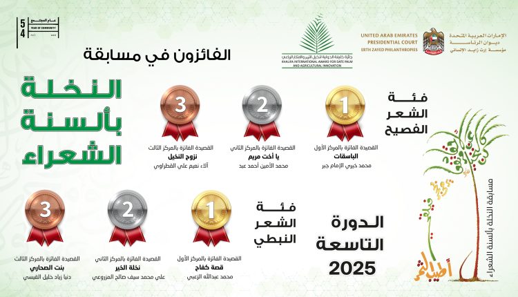 Khalifa International Award for Date Palm and Agricultural Innovation General Secretariat, announces the winners of the « Date Palm International Poetry » competition, in its 9th Session, 2025, which is held under the patronage of H.E. Sheikh Nahayan Mabarak Al Nahayan, Minister of Tolerance and Coexistence, Chairman of the Award’s Board of Trustees, and the results were as follows: