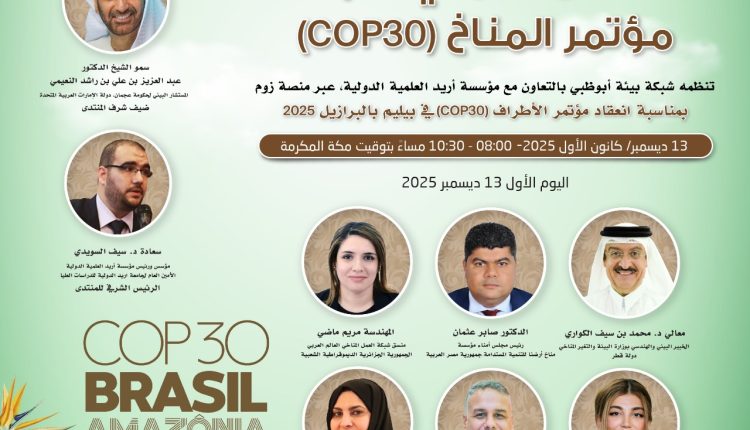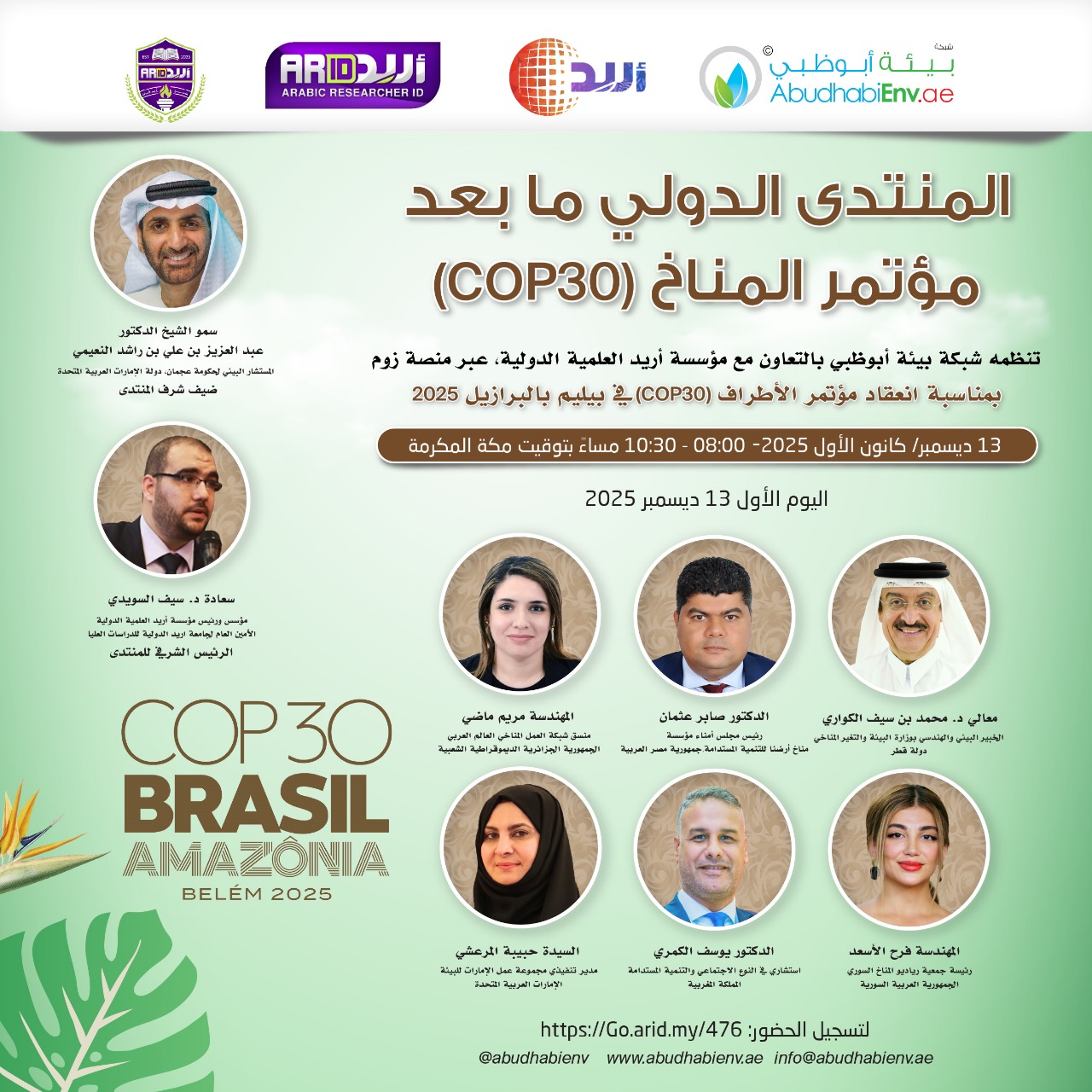 افتتحت شبكة بيئة أبوظبي، بالتعاون مع منصة أُريد الدولية، أعمال المنتدى الدولي للمناخ ما بعد مؤتمر الأطراف COP30، الذي عُقد عبر منصة زووم بتاريخ 13 ديسمبر 2025، بمشاركة نخبة من الباحثين والخبراء من تسع دول عربية، وبحضور رسمي رفيع المستوى عكس أهمية الحدث ومحوريته في المرحلة المقبلة من العمل المناخي.
