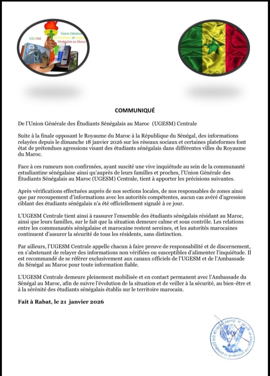 وفي السياق ذاته، دعا الاتحاد إلى التحلي بروح المسؤولية والحكمة، محذرًا من خطورة تداول أو إعادة نشر الأخبار غير الموثوقة التي من شأنها بث القلق والارتباك. ونصح بالاعتماد حصريًا على القنوات الرسمية للاتحاد العام للطلاب السنغاليين في المغرب (UGESM) وسفارة السنغال بالمغرب كمصادر موثوقة للمعلومة.