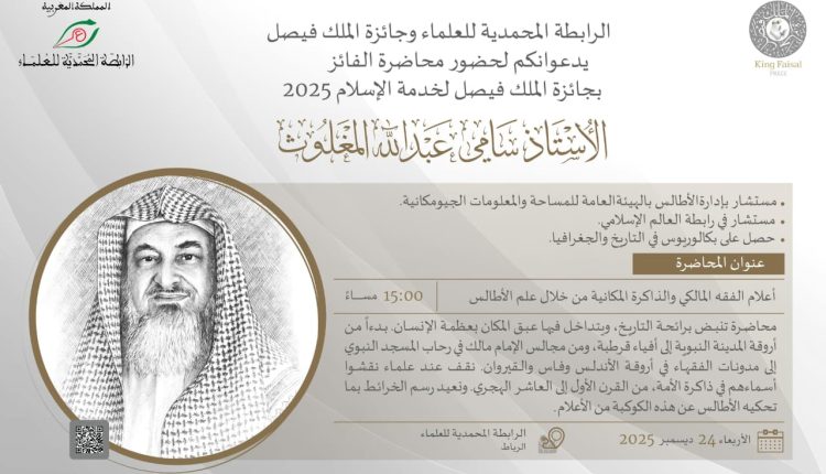 تنظم جائزة الملك فيصل، بالتعاون مع الرابطة المحمدية للعلماء بالمملكة المغربية، مساء يوم الأربعاء 24 ديسمبر 2025، في مقر الرابطة بالعاصمة الرباط، محاضرة علمية بعنوان “أعلام الفقه المالكي والذاكرة المكانية من خلال علم الأطالس”.