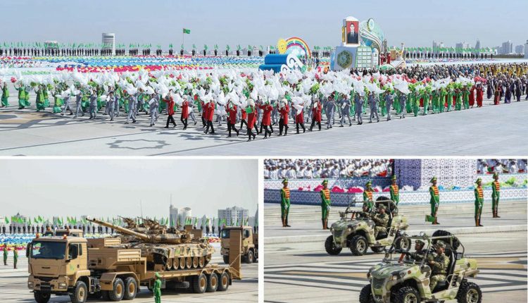 ومن المشاهد الملفتة للنظر هو اصطحاب فارسان يرتديان الزي الوطني حصانًا رائعًا من نوع “أخال تيكي” ذو المكانة التاريخية والتراثية لدى التركمان إلى الساحة، ثم انطلقت مواكب السيارات المزينة بأسلوب احتفالي، كاشفةً عن إنجازات ونجاحات مختلف قطاعات الاقتصاد الوطني في بلدنا، واحدة تلو الأخرى، وكان هذا الموكب المهيب دليلاً آخر على إنجازات تركمانستان الاقتصادية والتنموية والاجتماعية.