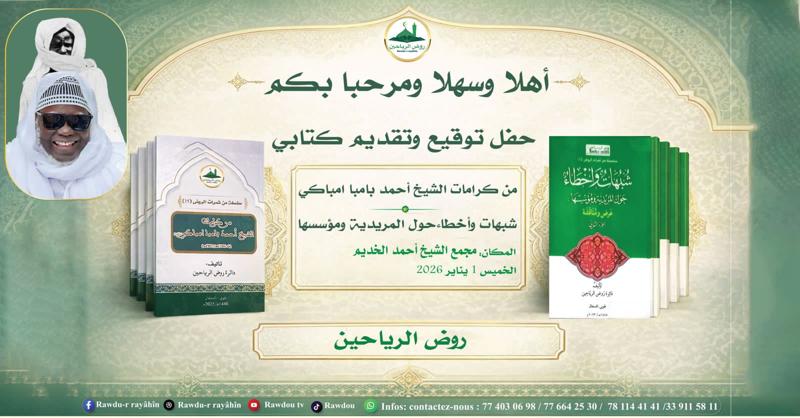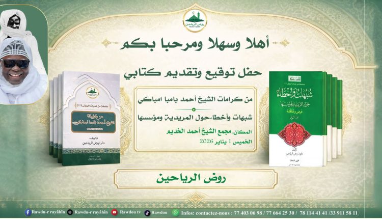 افتتحت دائرة «روض الرياحين» السنة الجديدة بحفل توقيع وإصدار كتابين جديدين في «مجمع الشيخ أحمد الخديم للتربية والتكوين»، برئاسة الشيخ أحمد البدوي امباكي، رئيس «المجمع» ومنسق «الدائرة»، وبحضور مشايخ وعلماء وباحثين.